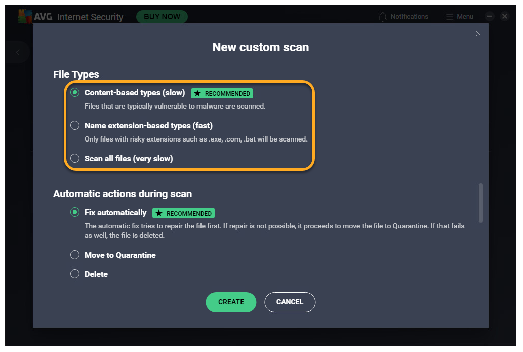 - Tipi basati sul contenuto (lenta) (selezionata per impostazione predefinita): selezionare questa opzione per esaminare i file generalmente più vulnerabili agli attacchi malware.