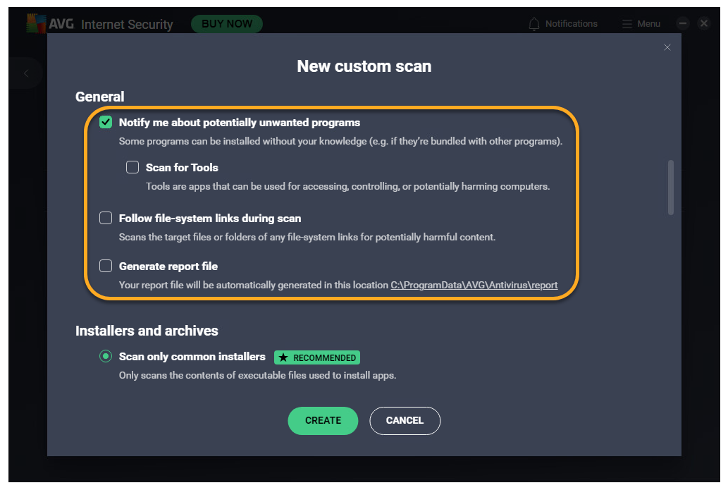 AVG AntiVirus consente di creare una scansione personalizzata e specificare i parametri. Fare riferimento alle sezioni di questo articolo per informazioni dettagliate sulla creazione di una nuova scansione personalizzata.