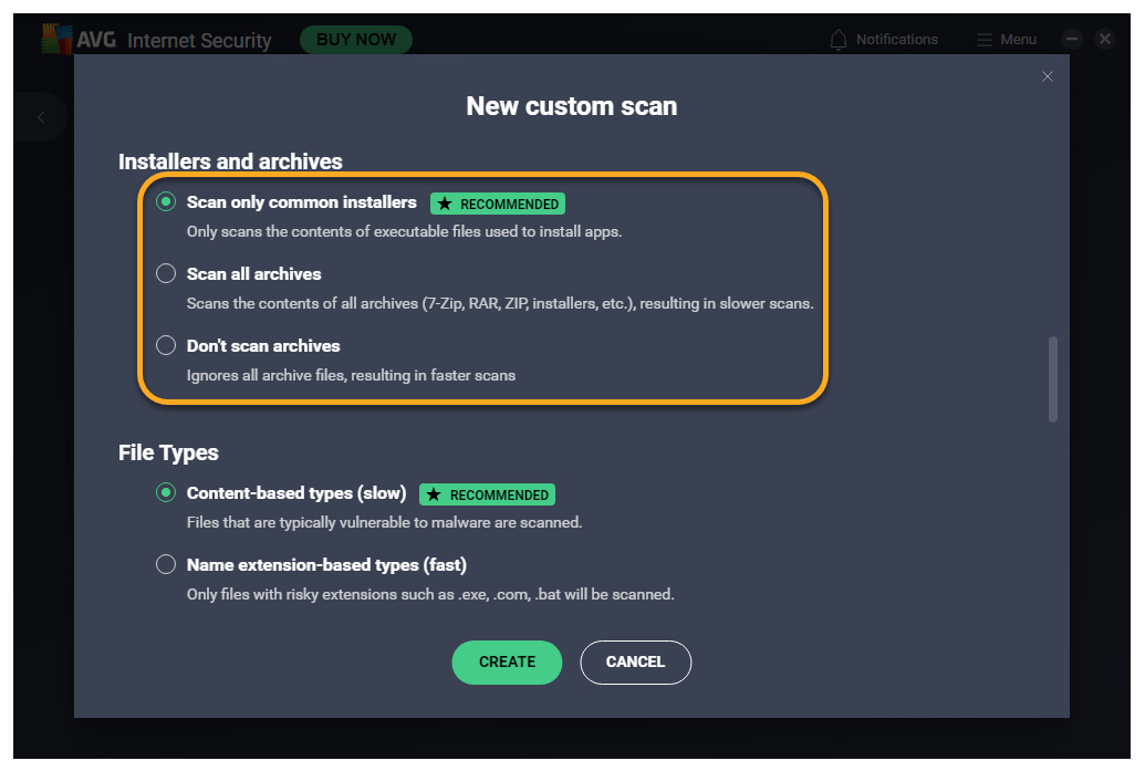 - Scansiona solo i programmi di installazione comuni (selezionata per impostazione predefinita): selezionare questa opzione per esaminare i tipi più diffusi di file archivio, come ZIP, RAR e altri file eseguibili o programmi di installazione compressi.