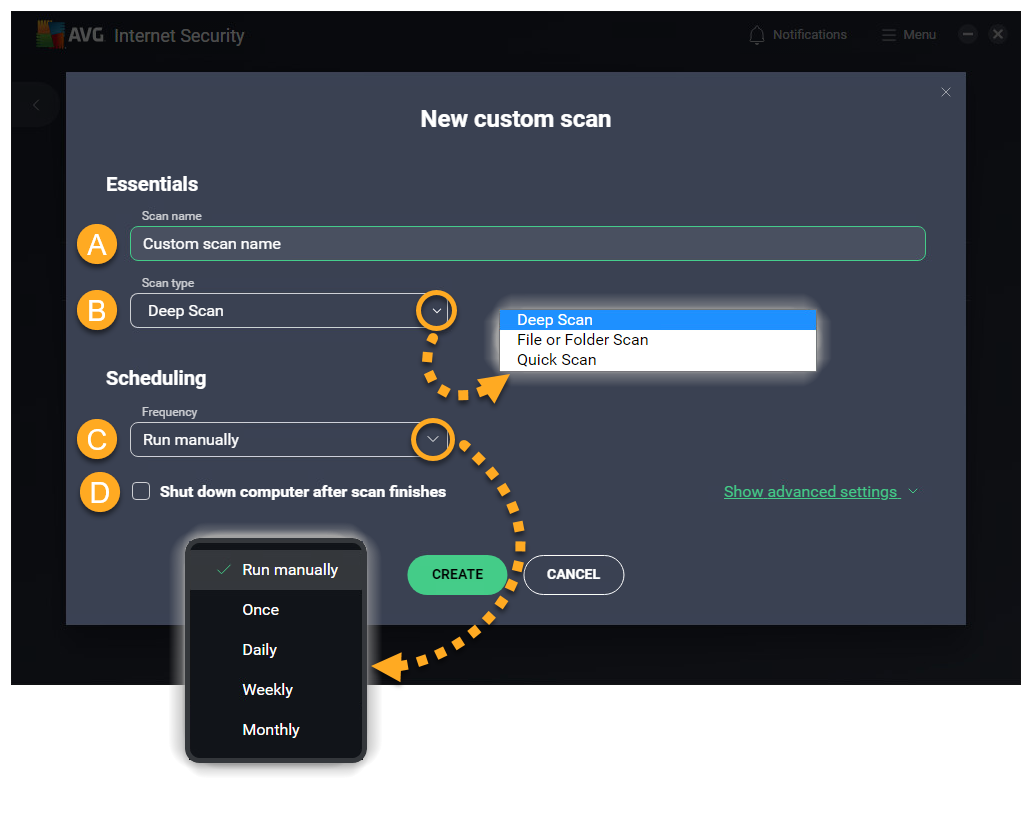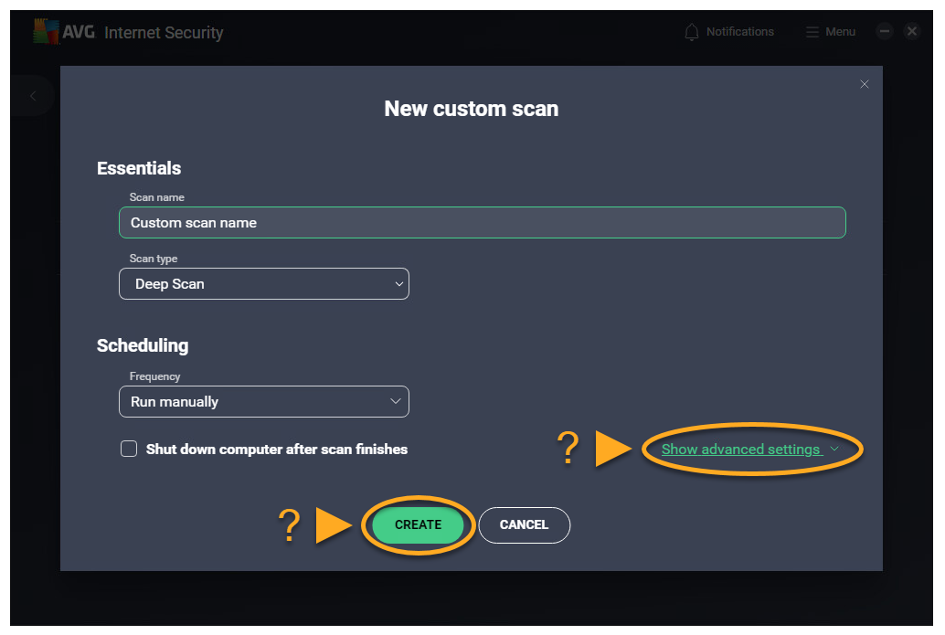 - Cliccare su Mostra impostazioni avanzate per regolare le impostazioni avanzate, oppure selezionare Crea per creare la scansione personalizzata con le impostazioni predefinite.