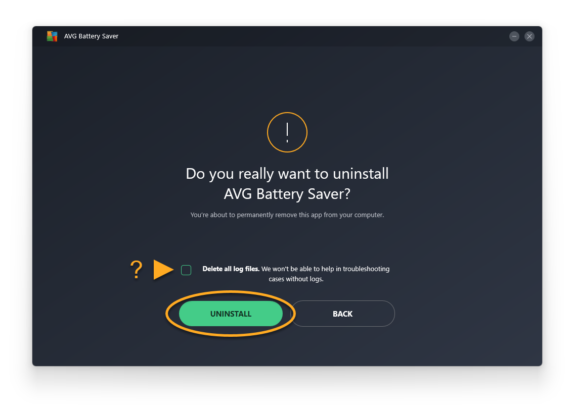 5. AVG バッテリー セーバーを再インストールしない場合、必要に応じて、すべてのログ ファイルを削除 の横のボックスにチェックを入れます。今後、AVG バッテリー セーバーを再インストールする予定がある場合は、トラブルシューティングの目的でログ ファイルが利用できるように、このボックスをチェックしないことをおすすめします。