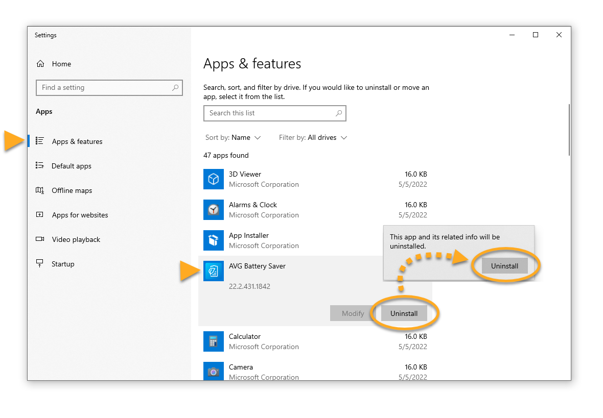 2. 左パネルで[アプリと機能]が選択されていることを確認し、[AVG バッテリー セーバー]をクリックして[アンインストール]を選択します。