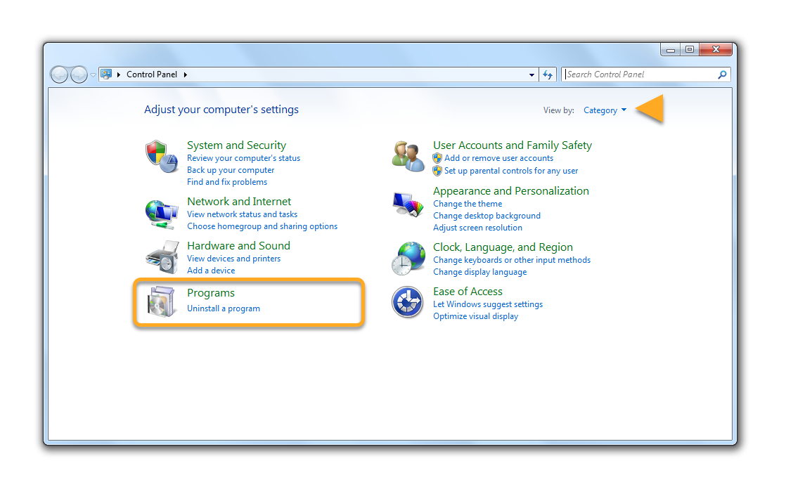 • オプション A(デフォルトのカテゴリ ビュー):[プログラム]で[プログラムのアンインストール]をクリックします。