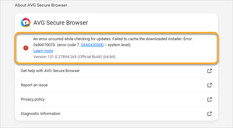 AVG セキュア ブラウザでアップデートの取得に問題がある場合は、以下のいずれかのエラー メッセージが表示される場合があります。