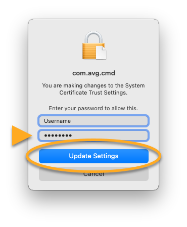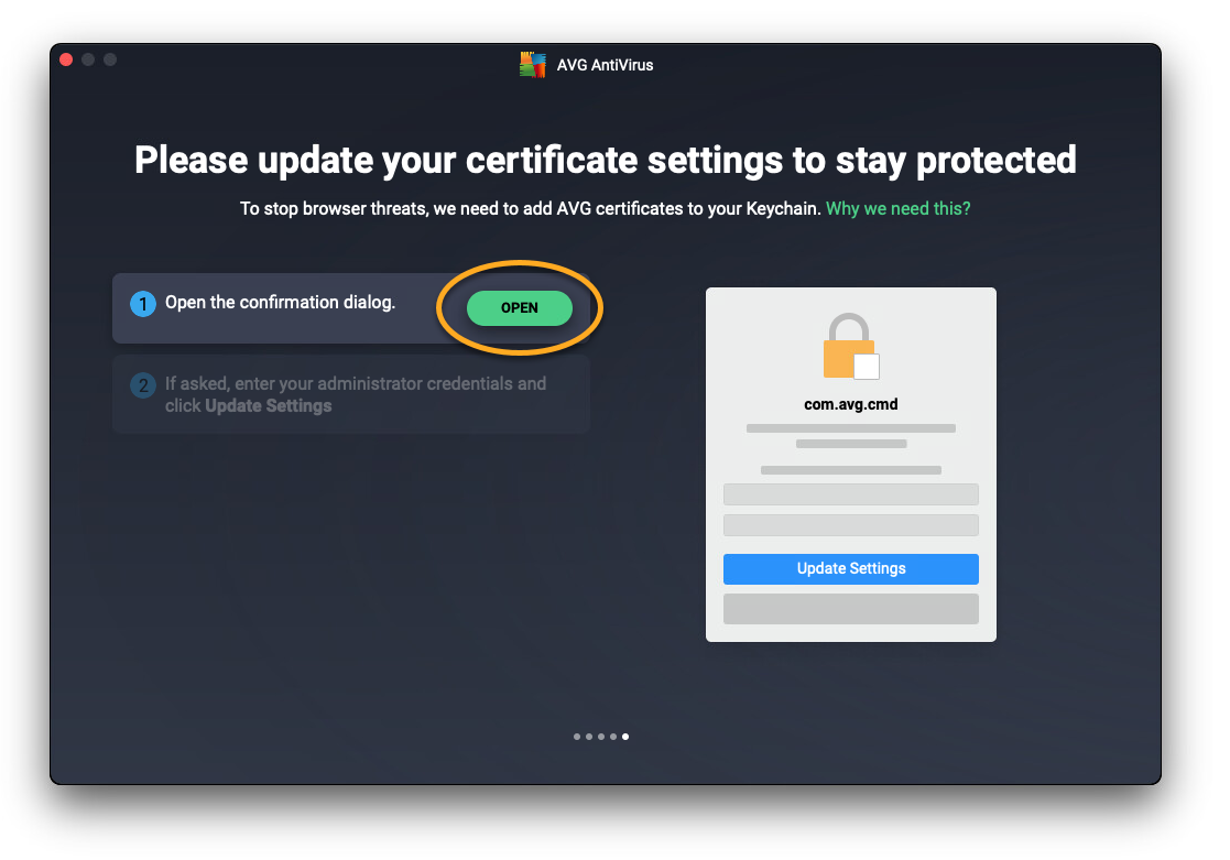 AVG 証明書を追加することにより、AVG アンチウイルスはブラウザの脅威を阻止することができます。キーチェーンに AVG 証明書を追加するようにダイアログが表示されたら、以下の手順に従います。