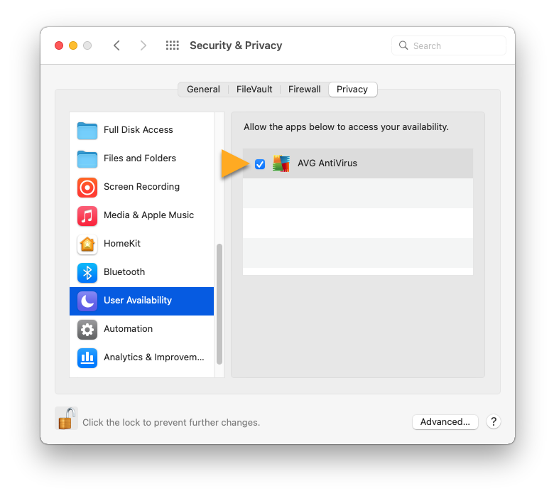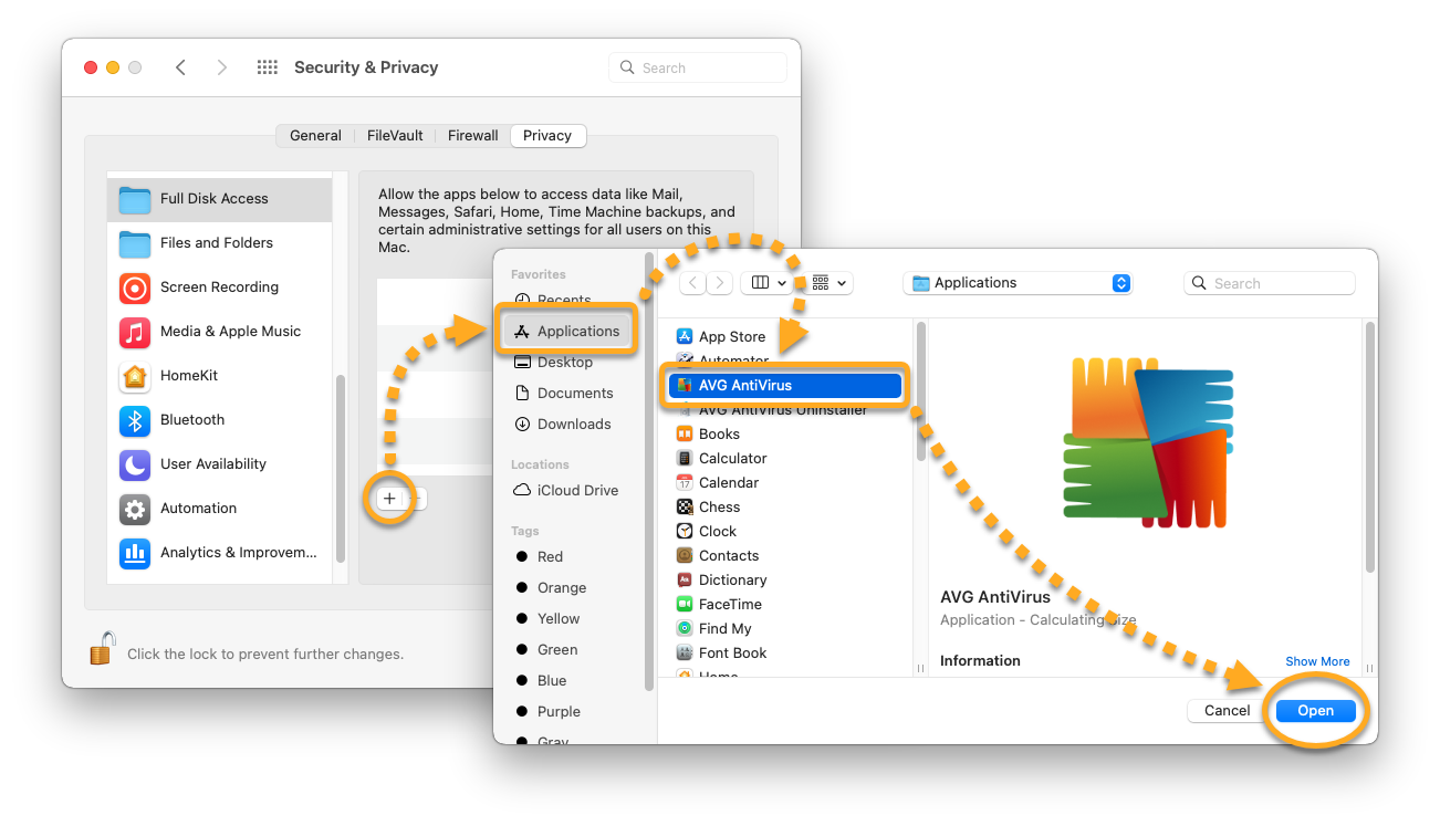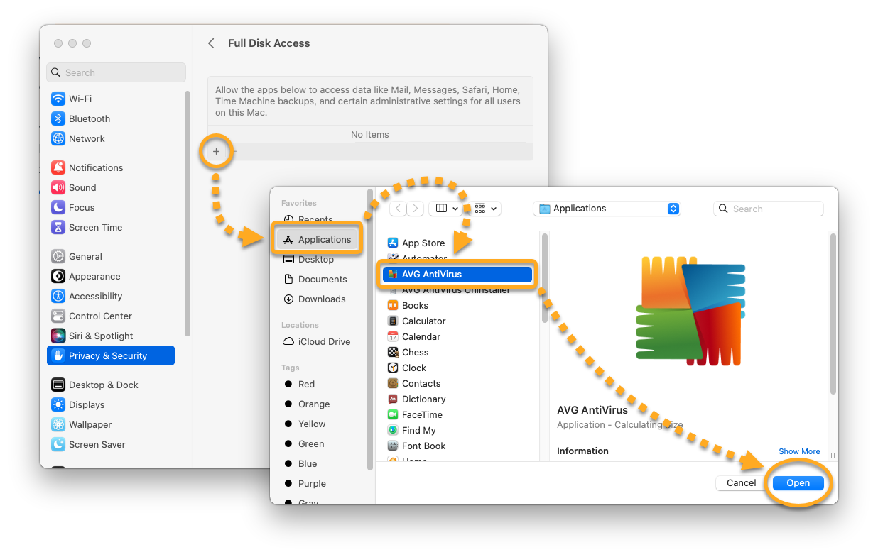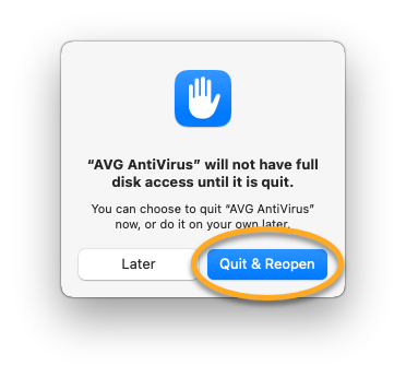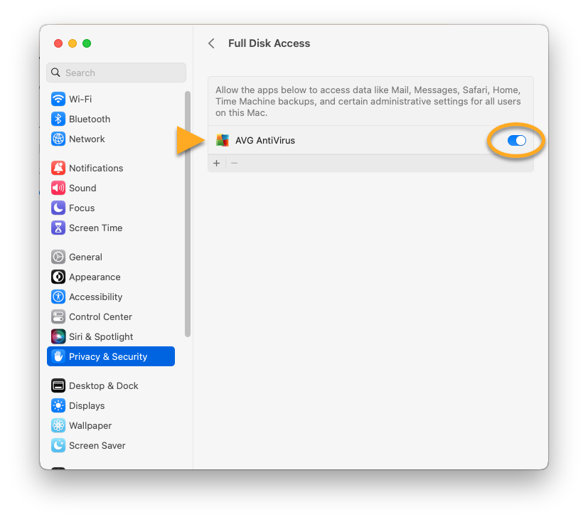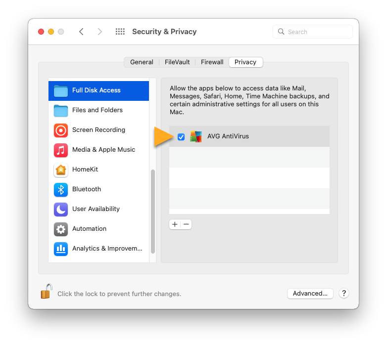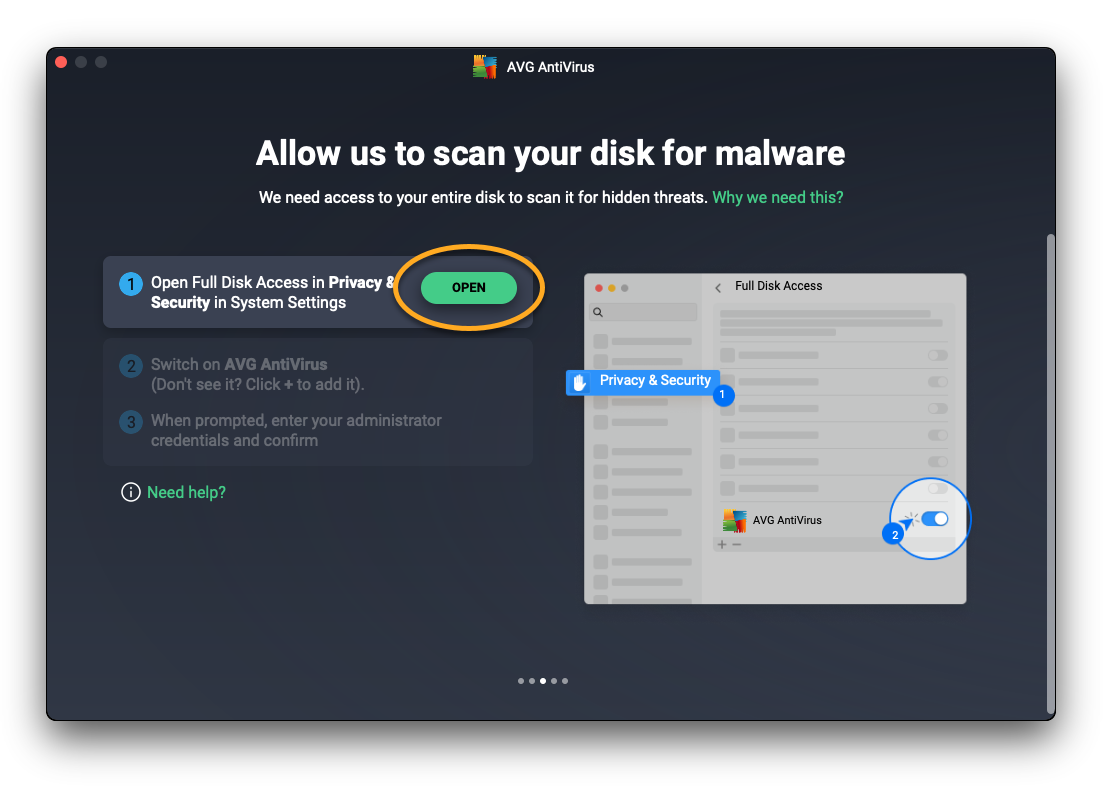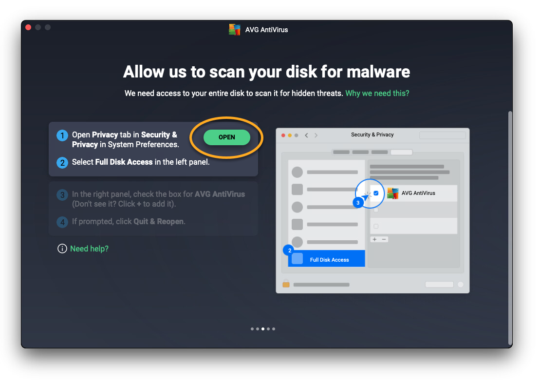 フル ディスク アクセスを許すると、お使いの Mac 全体に潜んでいる脅威を AVG アンチウイルスでスキャンできるようになります。