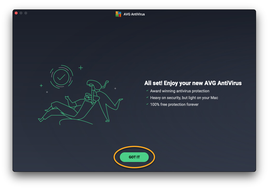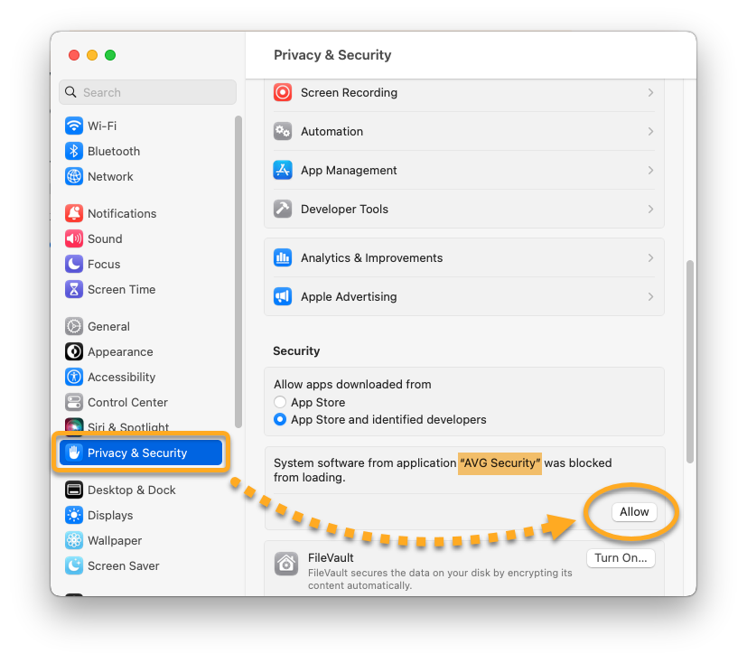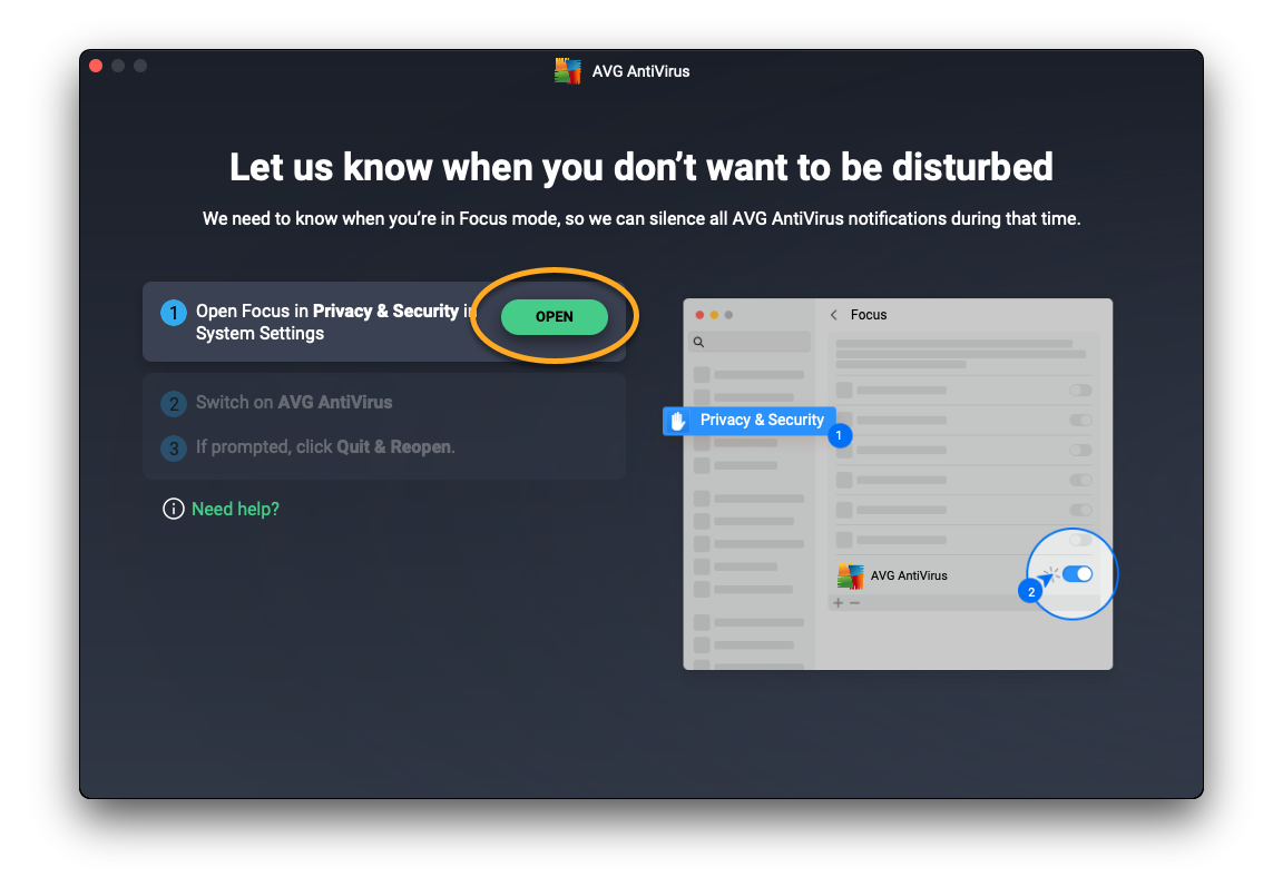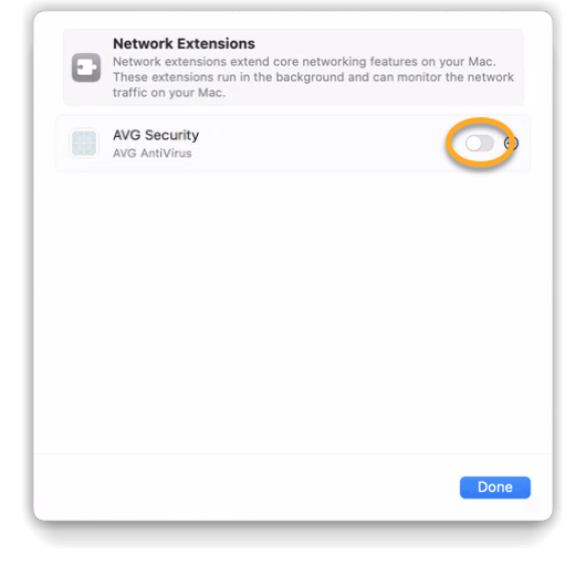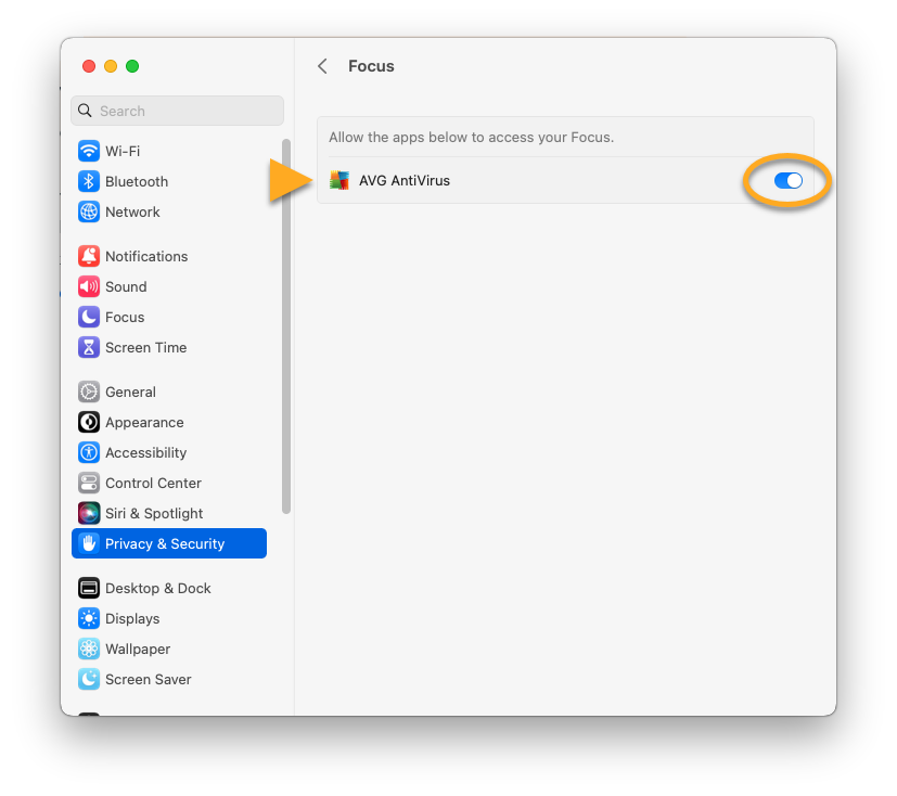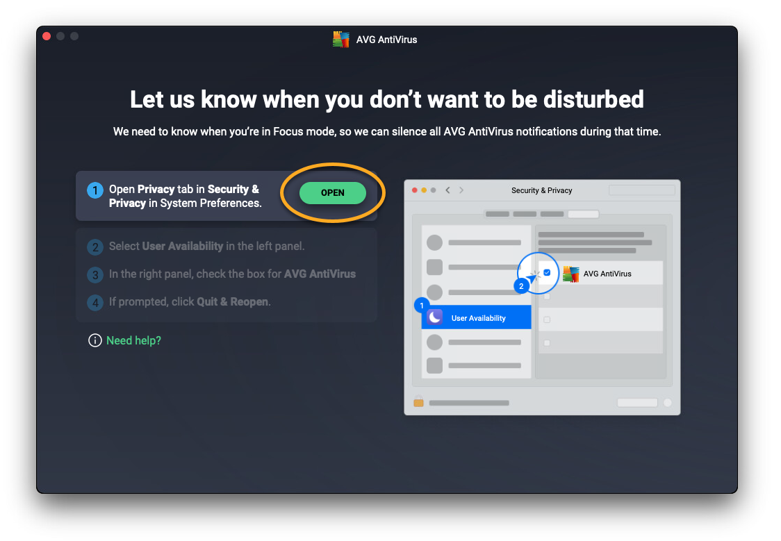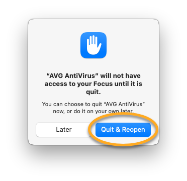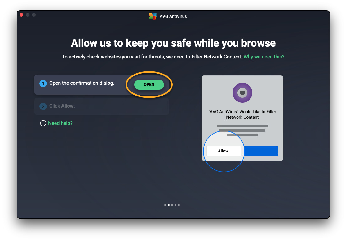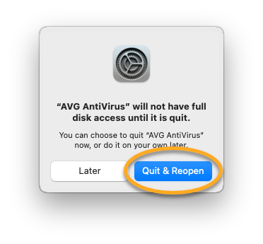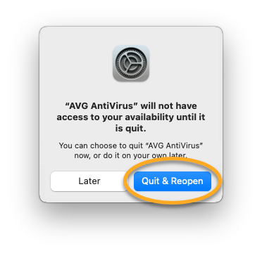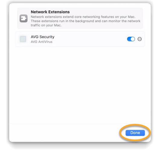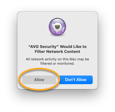 必要なDNSプロキシ設定が追加されました。AVG アンチウイルスのセットアップチュートリアルで、フルディスクアクセスを許可するように促されます。