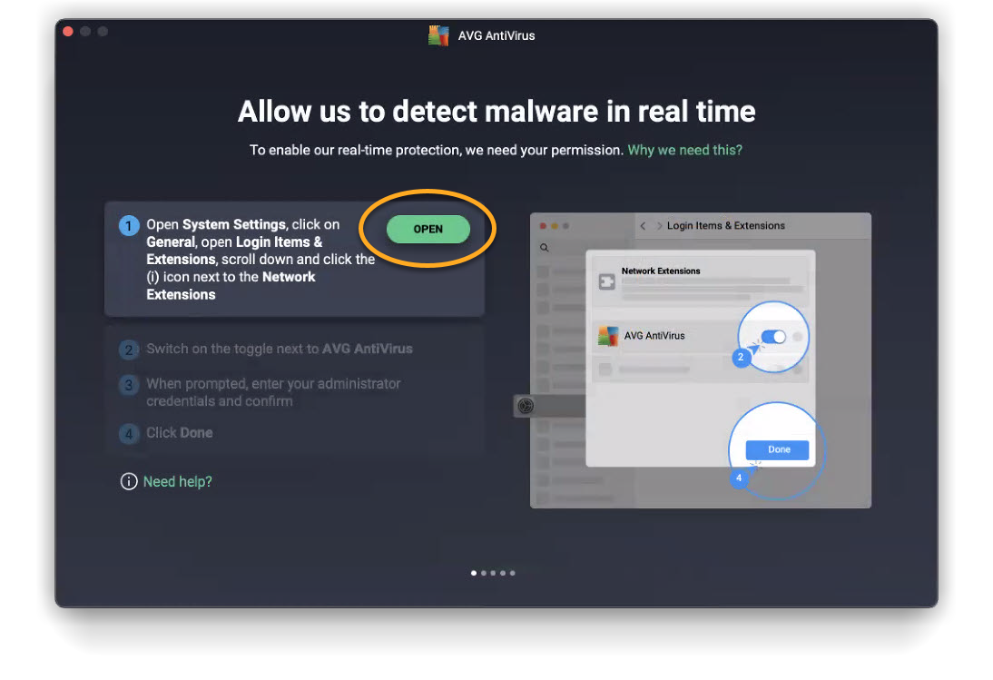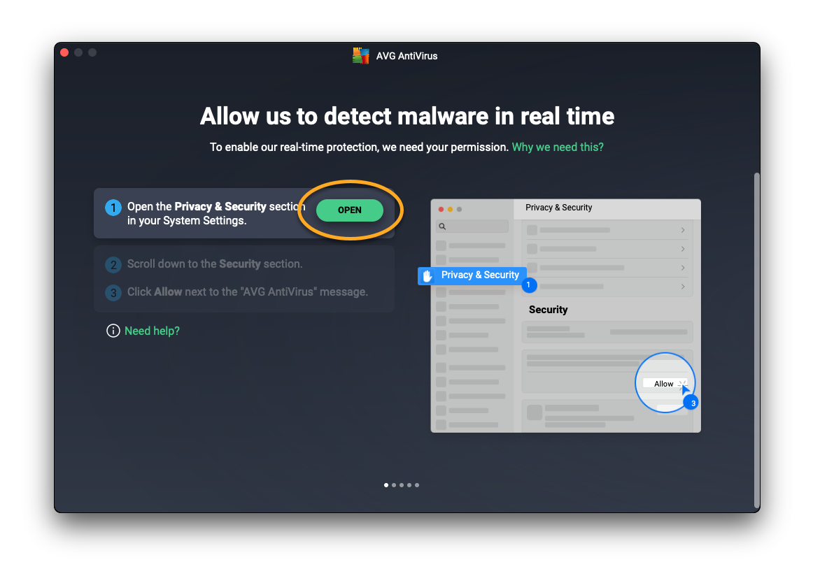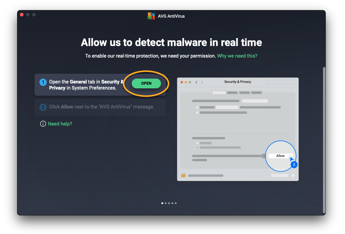 リアルタイム保護を有効にする権限を許可することにより、AVG アンチウイルスはお使いの Mac を保護し、リアルタイムでマルウェアを検出することができます。