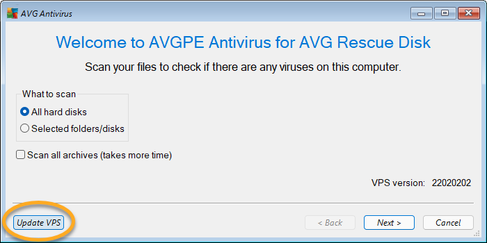- PC がインターネットに接続されている場合は、[VPS のアップデート]をクリックして、レスキュー ディスクが既知のウイルス定義の最新データベースを引き続き使用することを確認します