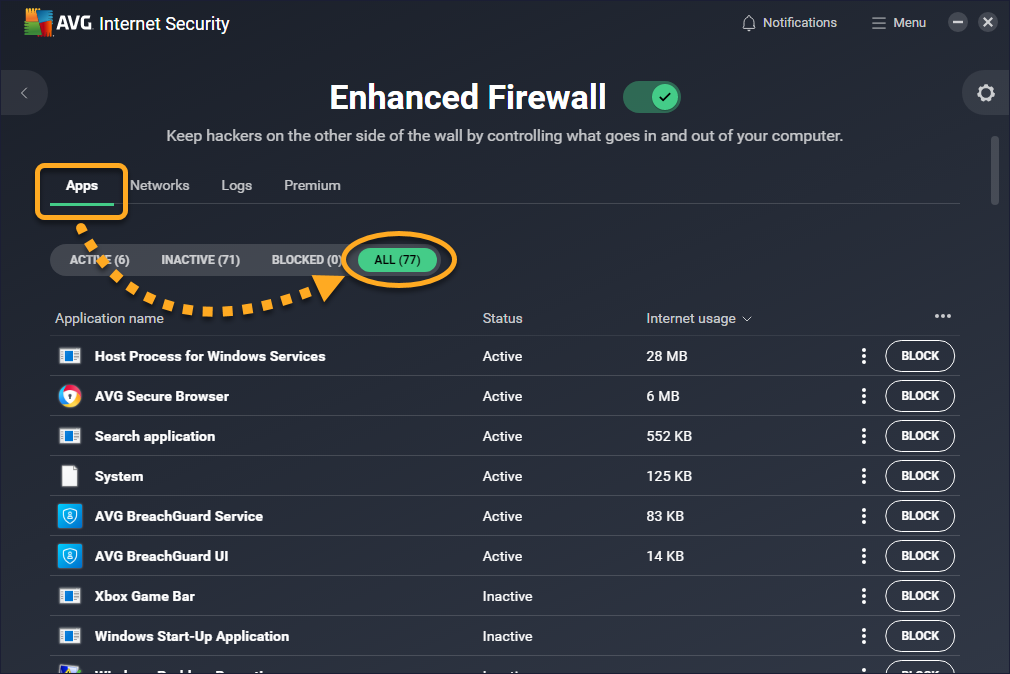 Wanneer een app voor het eerst verbinding probeert te maken met internet of een ander netwerk, worden standaardtoepassingsregels gemaakt. Als AVG Verbeterde firewall een vertrouwde toepassing blokkeert, kunt u de toepassingsregels voor uw app handmatig configureren door de onderstaande stappen te volgen: