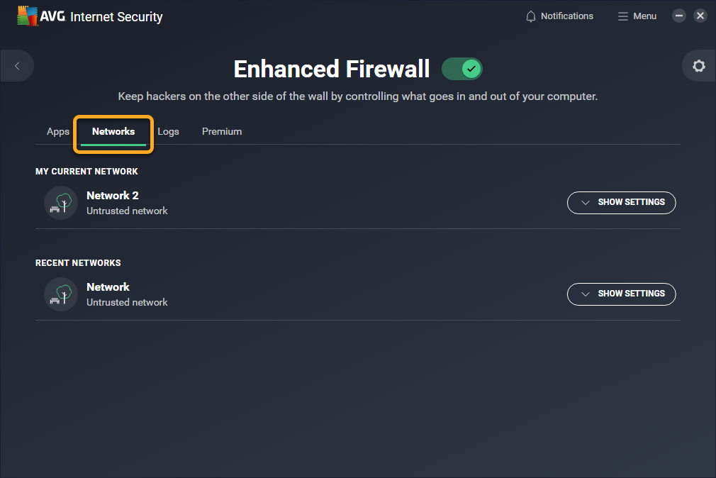 Uw netwerk is ingesteld op Vertrouwd. Wanneer u met een Vertrouwd netwerk bent verbonden, worden de meeste apps en apparaten toegestaan omdat er minder Verbeterde firewall-beperkingen gelden.