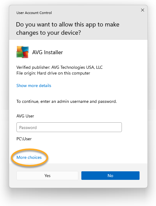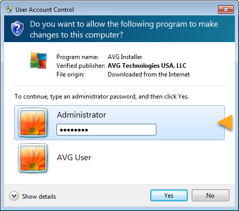 Standaard moet u actief toestemming geven voor het installeren of opnieuw installeren van software in Windows. Dat voorkomt dat virussen, malware en onbevoegden zonder toestemming ongewenste software installeren. Voordat u AVG-software installeert, is het raadzaam om u aan te melden bij Windows als een gebruiker met beheerdersrechten om de autorisatieprocedure te vergemakkelijken.