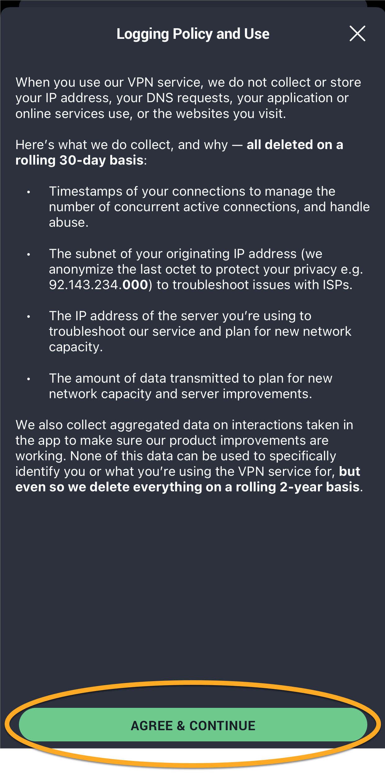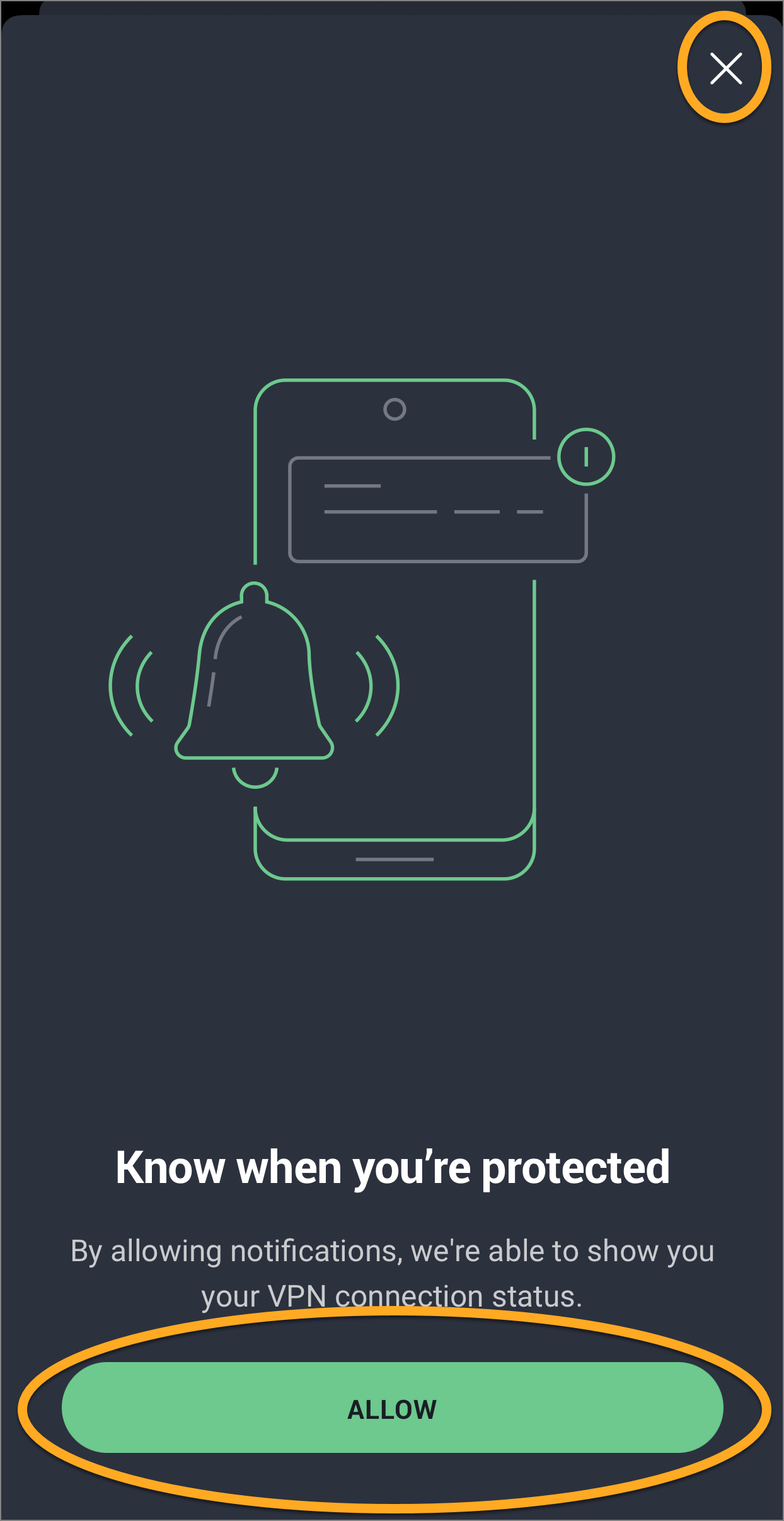- Jeśli zostanie wyświetlony monit, możesz nacisnąć opcję Zezwalaj, aby zezwolić programowi AVG Secure VPN na automatyczne nawiązywanie połączenia. Alternatywnie naciśnij ikonę X w prawym górnym rogu, aby wrócić do ekranu głównego aplikacji.