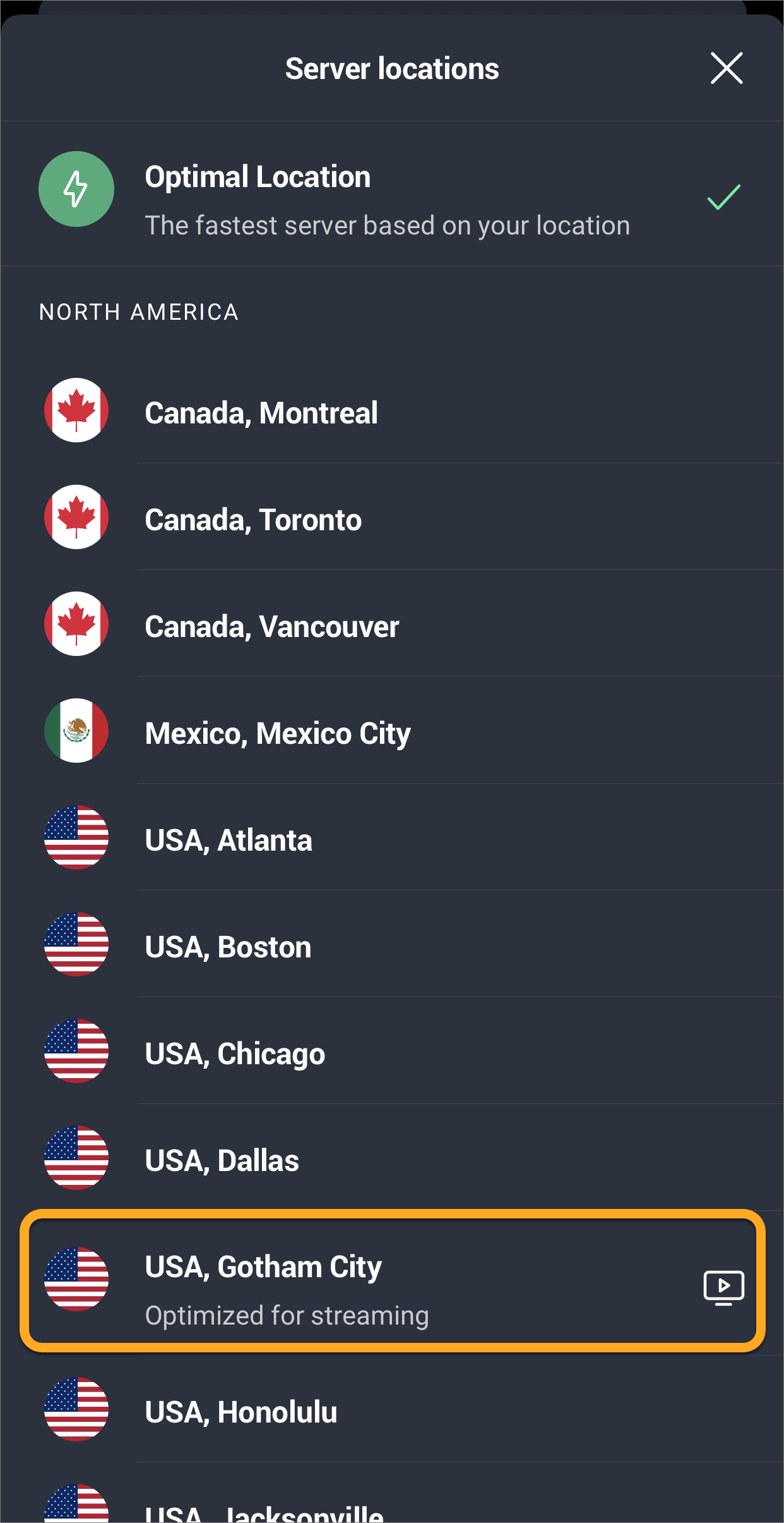 AVG Secure VPN używa serwerów znajdujących się w różnych lokalizacjach. Oznacza to, że można pominąć ograniczenia związane z położeniem geograficznym i korzystać z ulubionej zawartości podczas podróży. Domyślnie połączenie jest nawiązywane z punktem Optymalna lokalizacja.