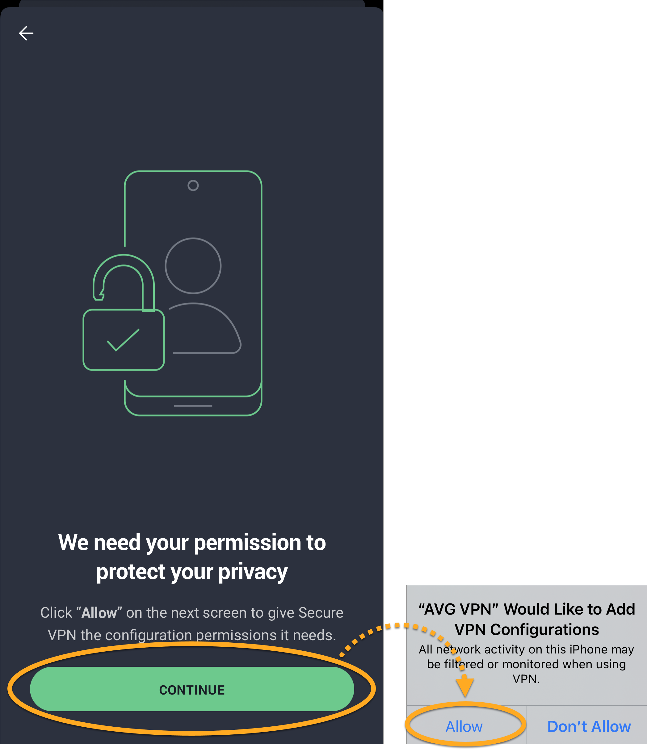 - Jeśli zostanie wyświetlony monit, naciśnij kolejno opcje Kontynuuj ▸ Zezwalaj, aby przyznać aplikacji AVG Secure VPN uprawnienie do skonfigurowania połączenia VPN.