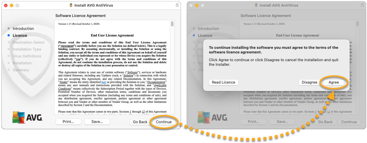 - Clique em Continuar para confirmar que você leu o Contrato de Licença de Usuário Final e clique em Concordo para confirmar que você aceita os termos.