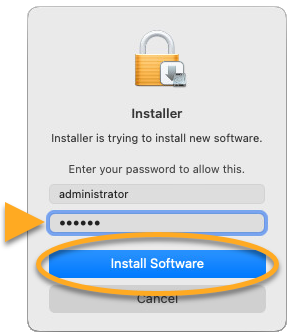 - Se solicitado, use o Touch ID para conceder permissão para a instalação ou clique em Usar senha..., digite a senha que você usa ao iniciar o Mac e clique em Instalar software.