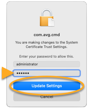 - Se solicitado, use o Touch ID para permitir que o AVG Internet Security faça alterações nos ajustes de confiança dos certificados do sistema ou digite a senha que você usa ao iniciar o Mac e clique em Atualizar ajustes.