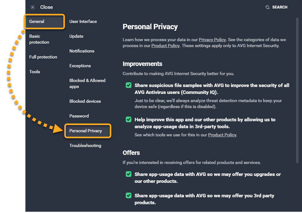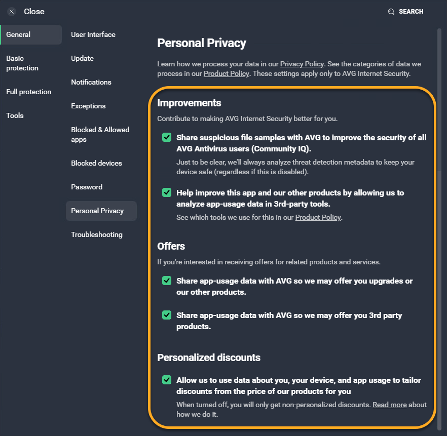 Você pode optar por não aderir ao compartilhamento de dados quando quiser. Consulte as seções pertinentes neste artigo para obter instruções detalhadas sobre como gerenciar as configurações de privacidade nos aplicativos AVG.