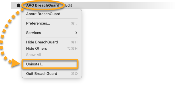 1. Abra o AVG BreachGuard, e depois clique em AVG BreachGuard na barra de menu da Apple e selecione Desinstalar....
