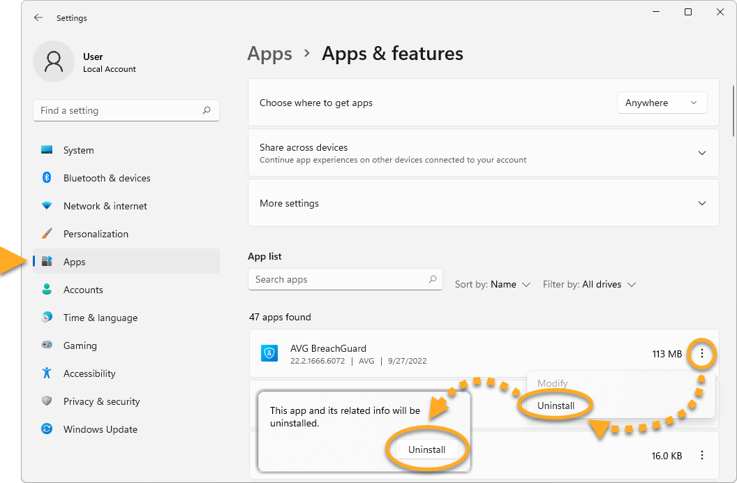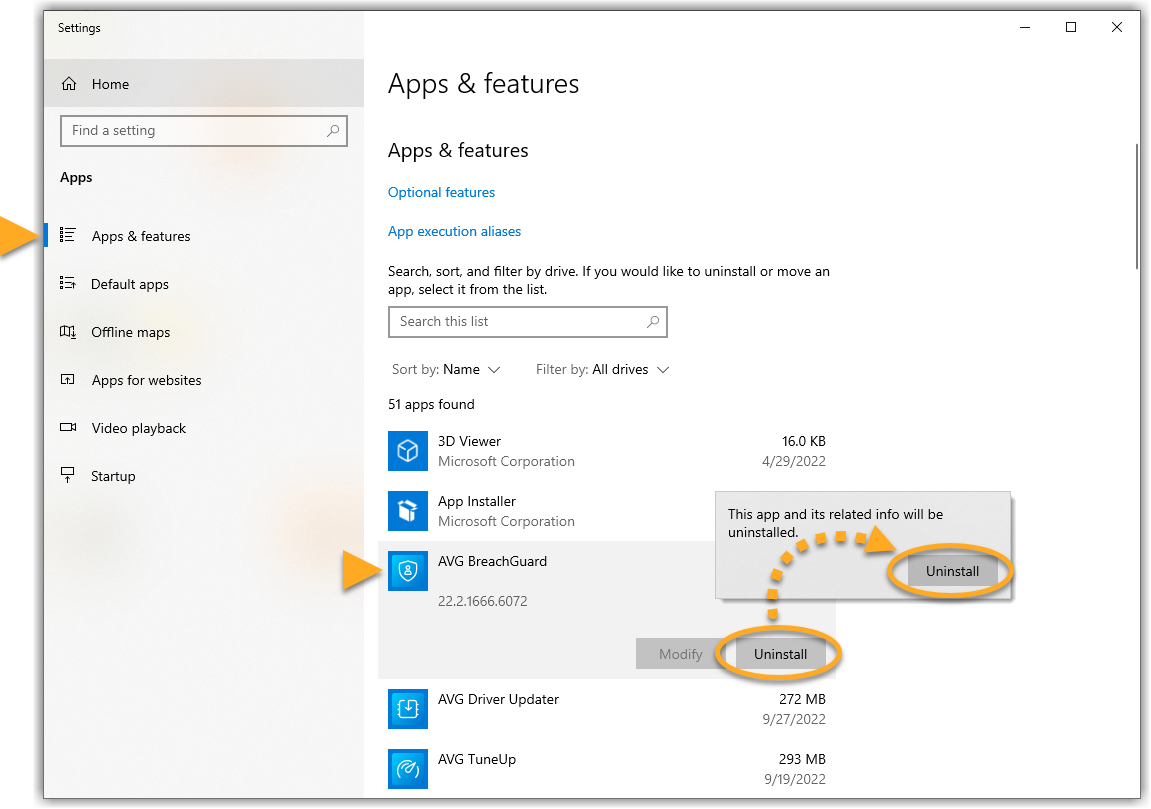 2. Veja se Aplicativos e Recursos está selecionado no painel esquerdo e depois clique em AVG BreachGuard e selecione Desinstalar.