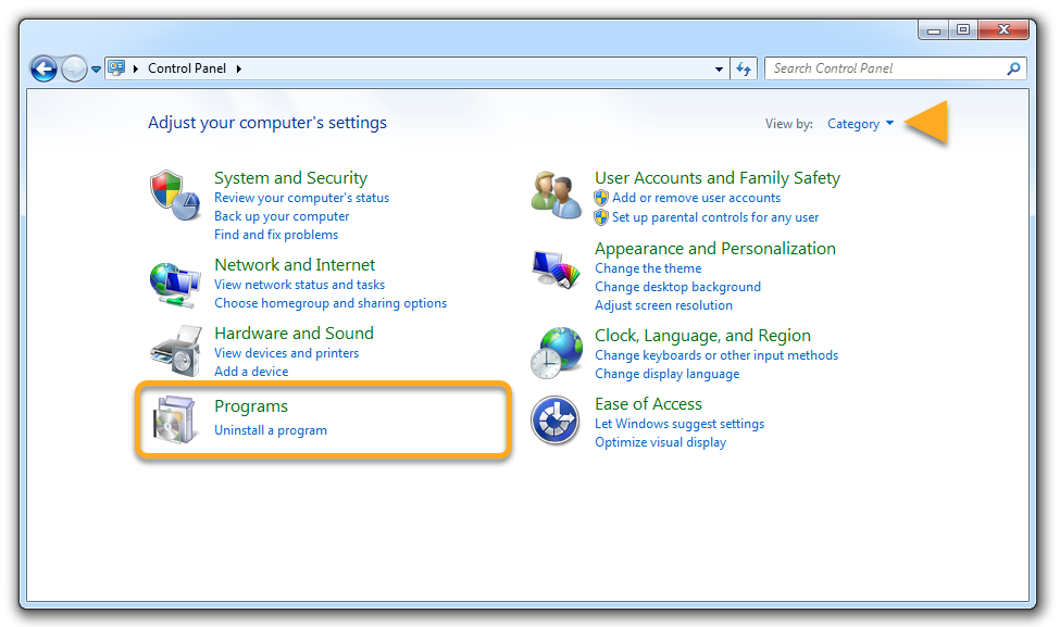 • Opção A (Exibição padrão de categoria): Em Programas, clique em Desinstalar um programa.