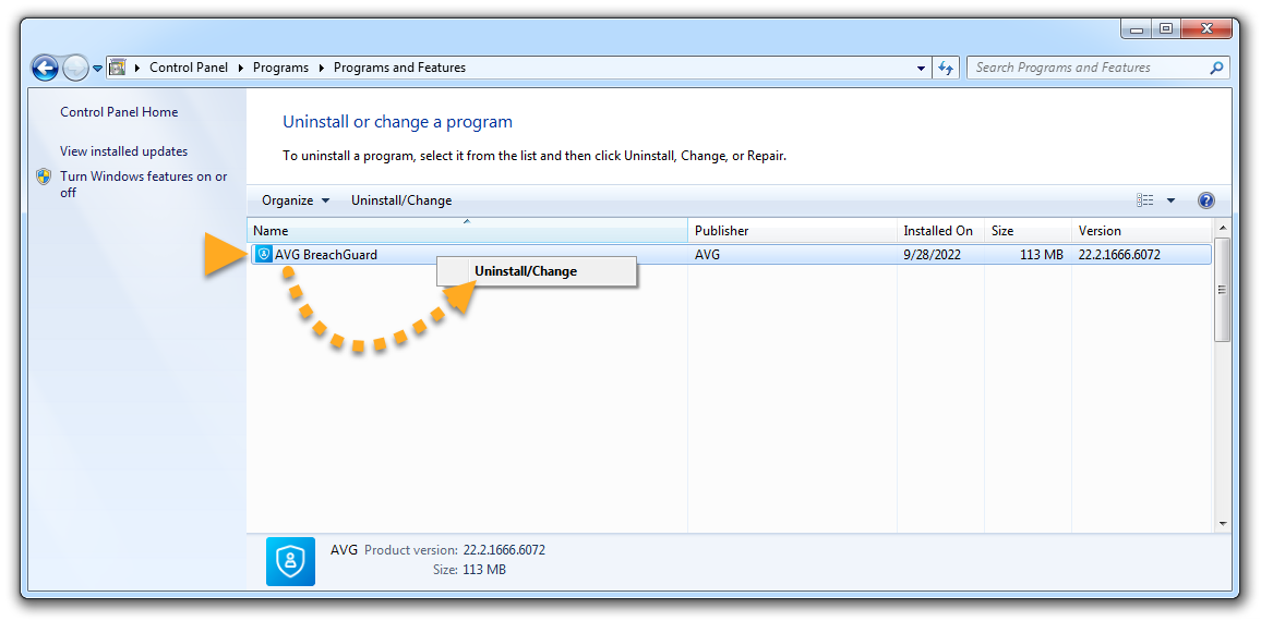 3. Clique com o botão direito em AVG BreachGuard e depois selecione Desinstalar/Alterar no menu suspenso.