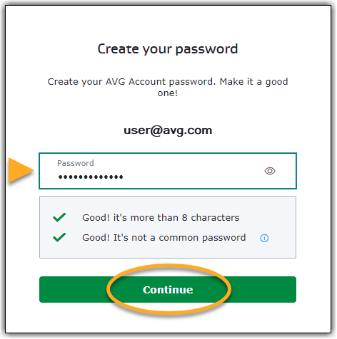 - Insira uma senha para sua Conta AVG e depois clique em Continuar.