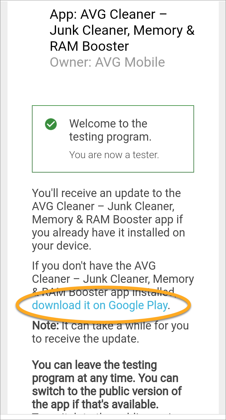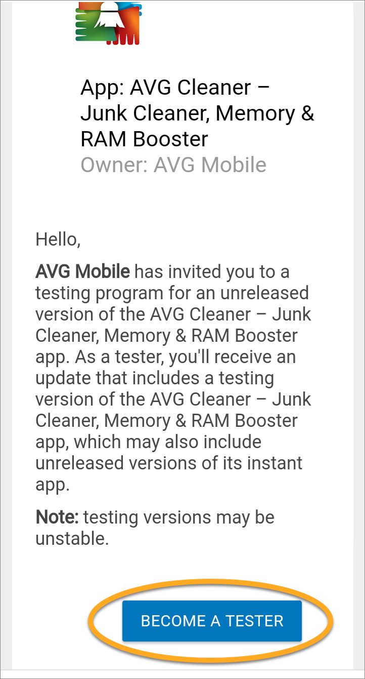 Joining beta tester groups gives you the opportunity to test the latest versions of AVG Android apps before public release. You can help us improve our apps by providing feedback.