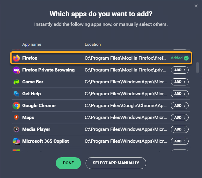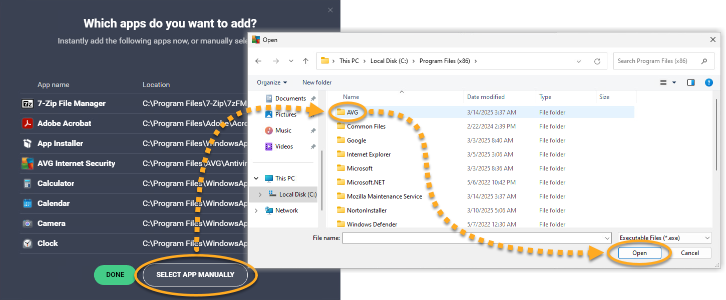 • Option B: Click Select app manually, then navigate to the application, and click Open.