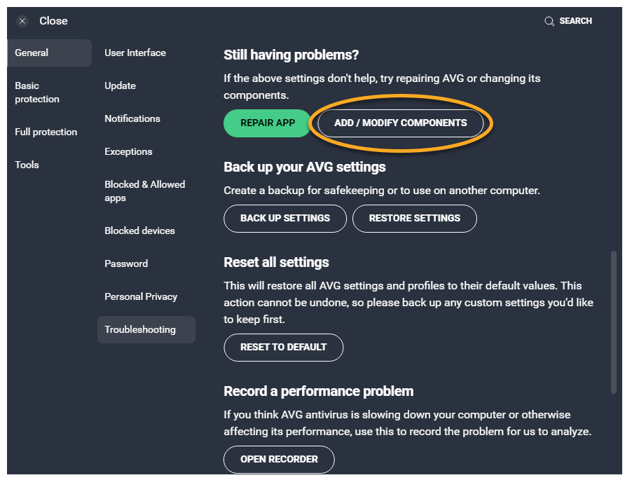 3. Under Still having problems?, click Add / modify components.