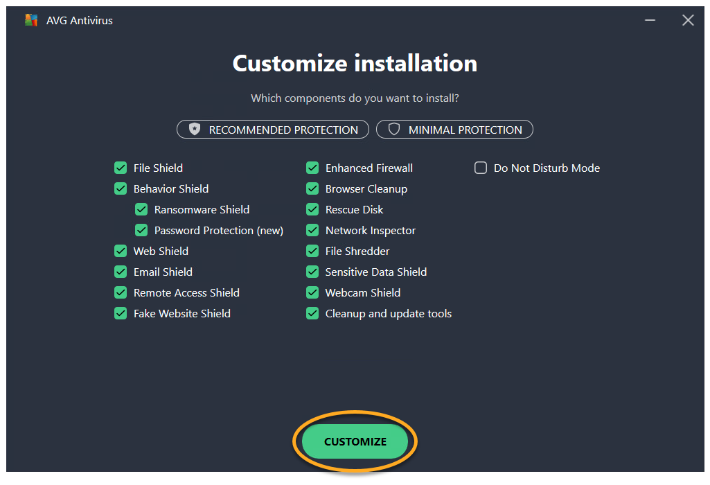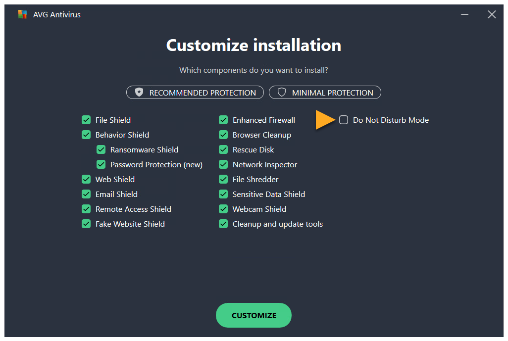 Do Not Disturb Mode is now removed from AVG AntiVirus. To add it back, repeat steps 1-2, tick the box next to Do Not Disturb Mode and click Change.