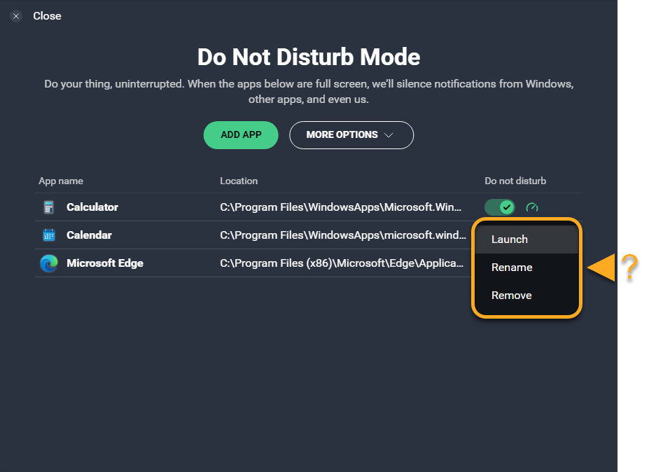 • Rename: Allows you to change the application name displayed in the Do Not Disturb Mode list.