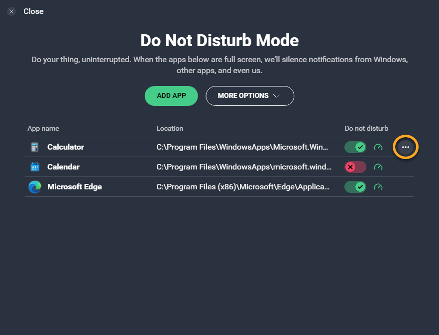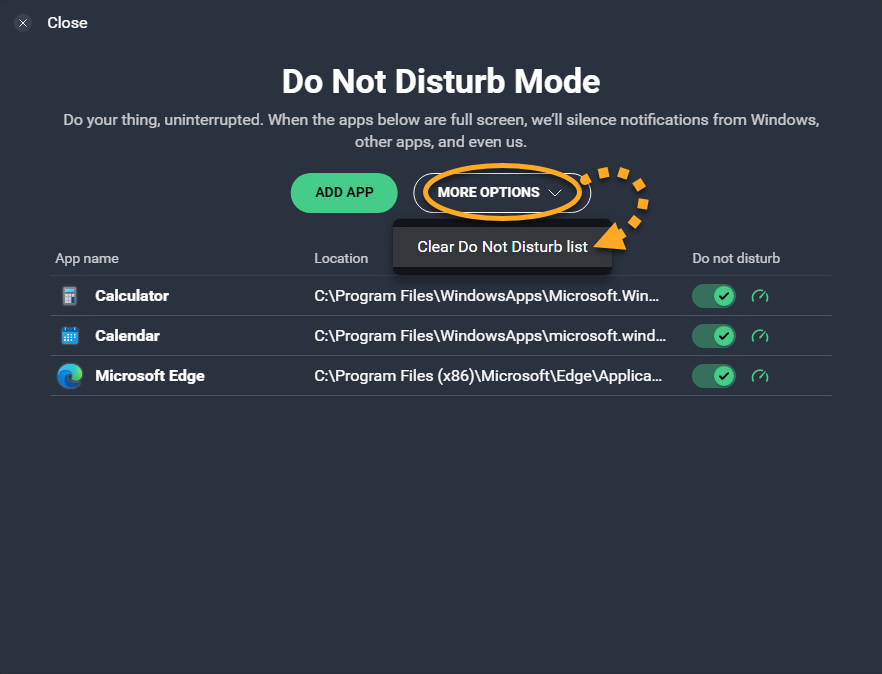 • To remove all applications from the list: Click the More options button and select Clear Do Not Distrub list.