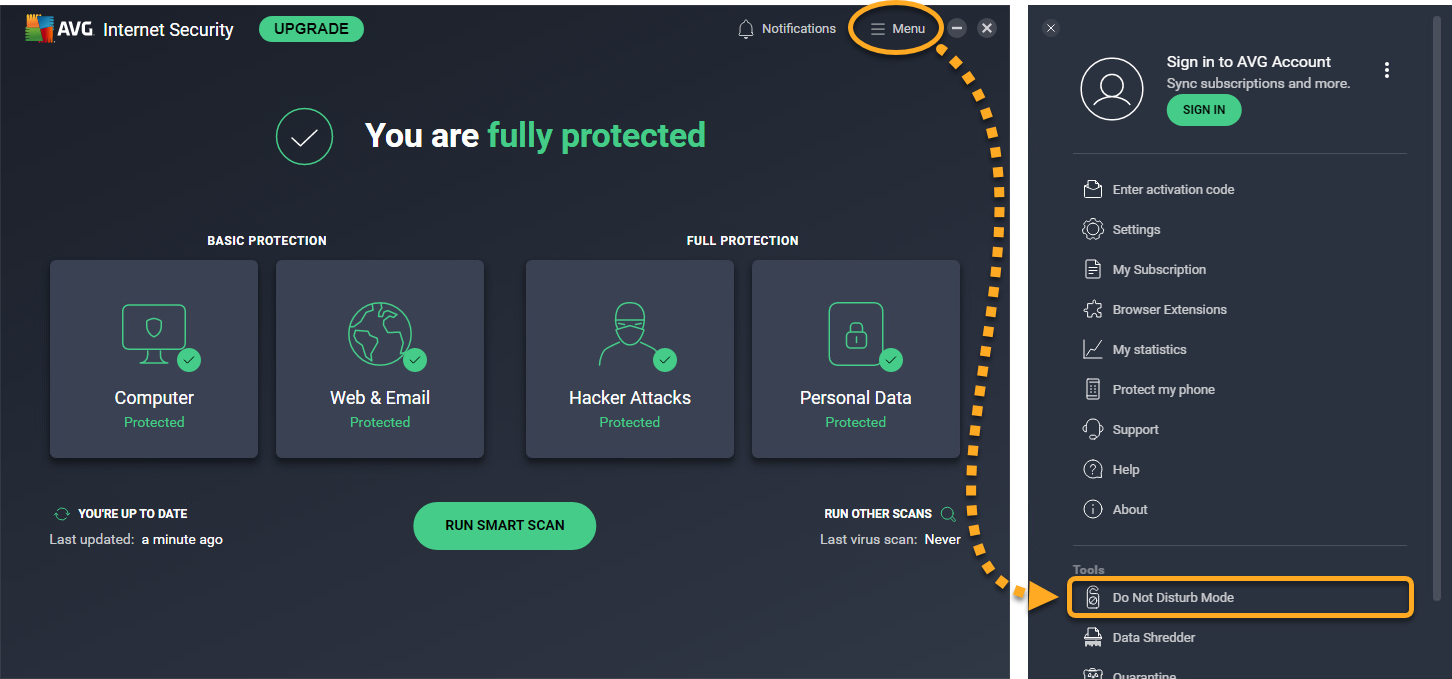 1. Open AVG Antivirus and go to MenuDo Not Disturb Mode.