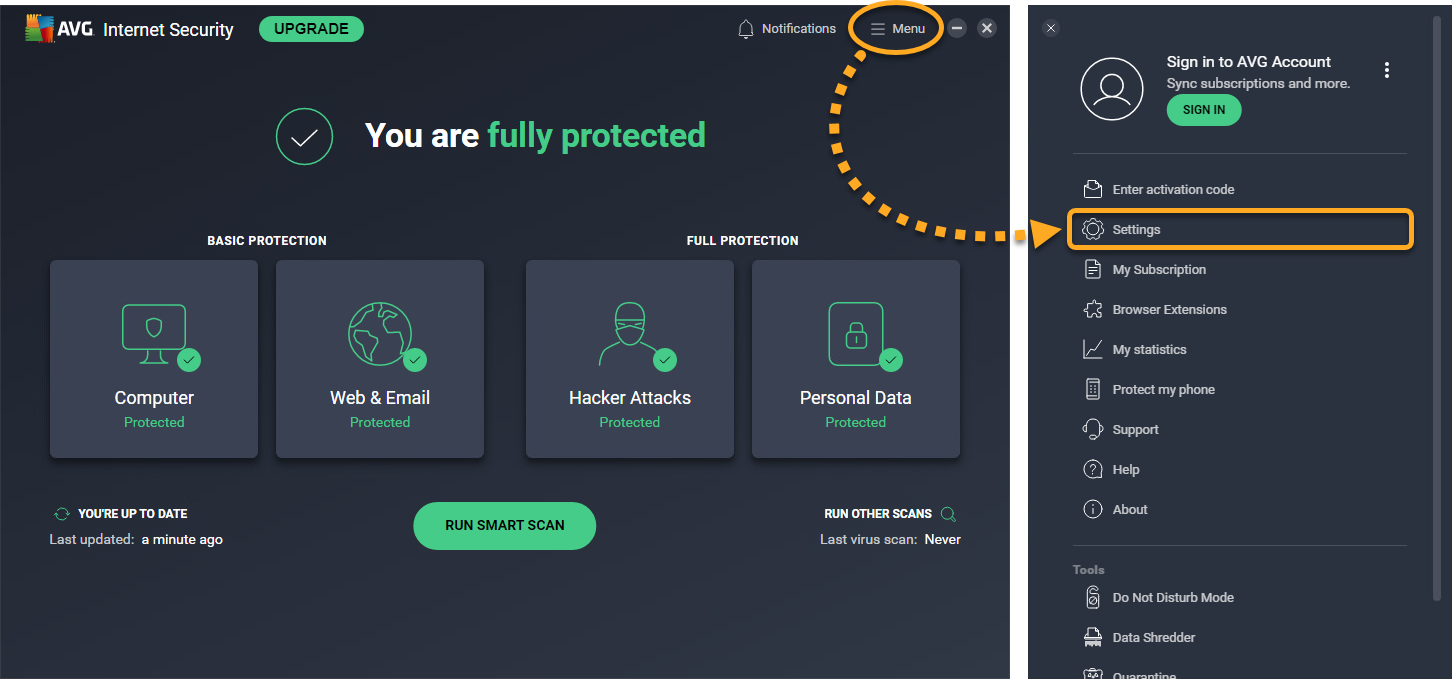 1. Open AVG Antivirus and go to MenuSettings.