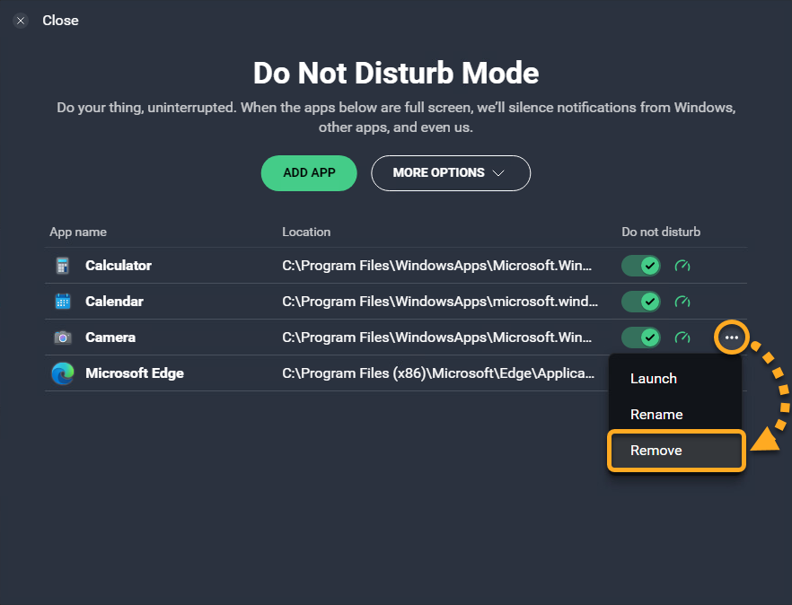 • Remove: Removes the application from the Do Not Disturb Mode list.