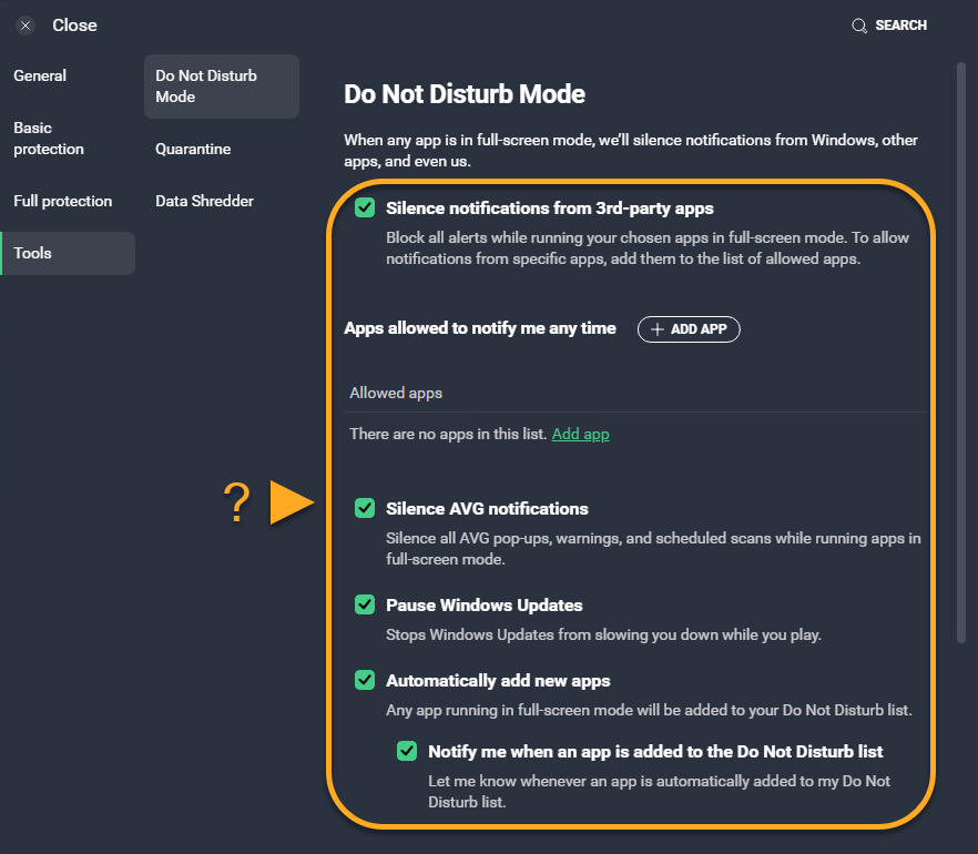 Do Not Disturb Mode is automatically installed and enabled in AVG AntiVirus to silence notifications while applications are in fullscreen. To uninstall the feature:
