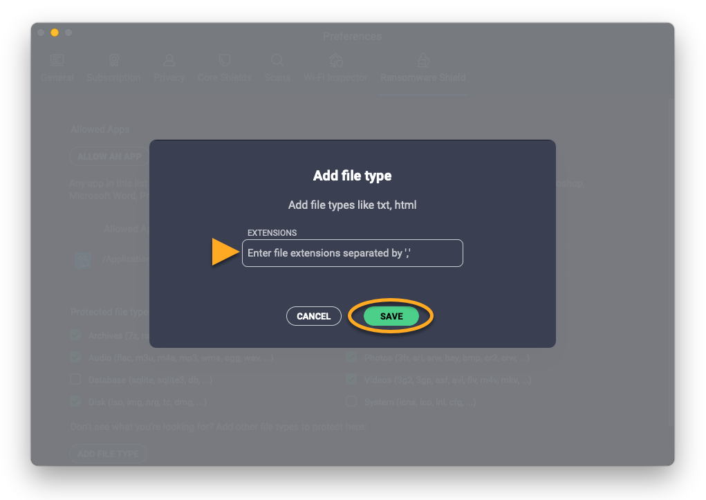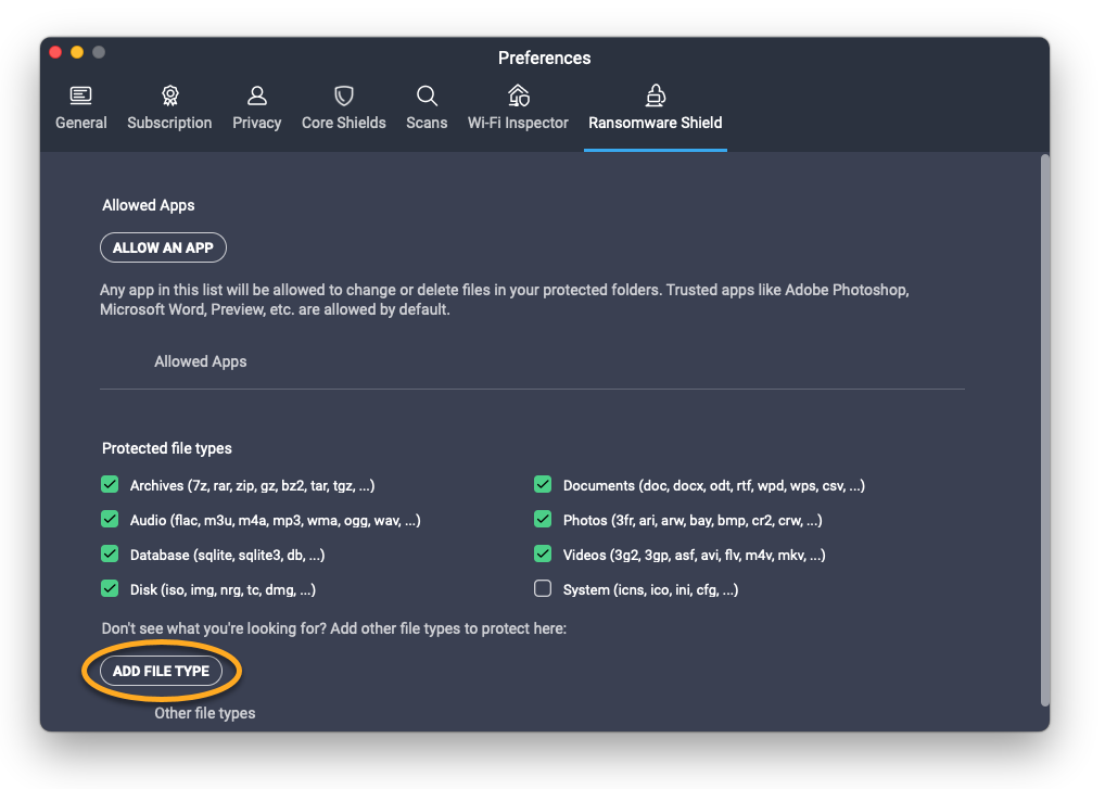 - Scroll to File types to view which file types are secured in your protected folders. All listed file types are selected by default. Untick the box next to a file type to deselect it. Additionally, you can add a file type not listed, by typing it into the box below the default list.