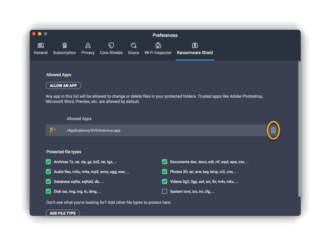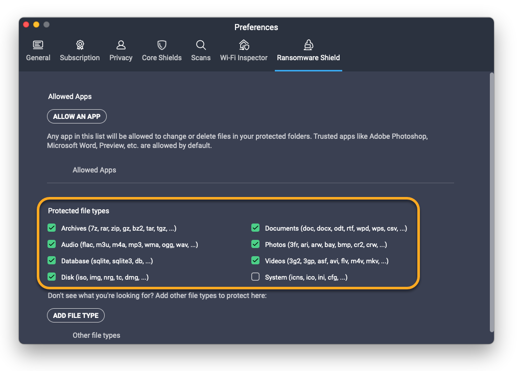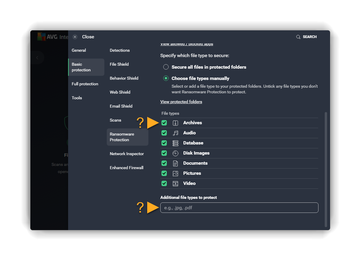 - In the Protected file types section, you can view which file types are secured in your protected folders. Tick the box next to the file types you want Ransomware Protection to protect, or untick any file types that you do not want protected by Ransomware Protection.