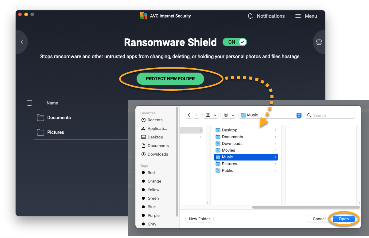 - To add a folder: Click Protect new folder, navigate to the folder, and click Open. If prompted, enter the password that you use when you start your Mac, then click OK.