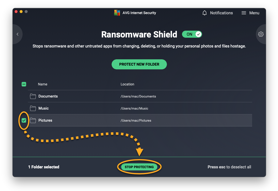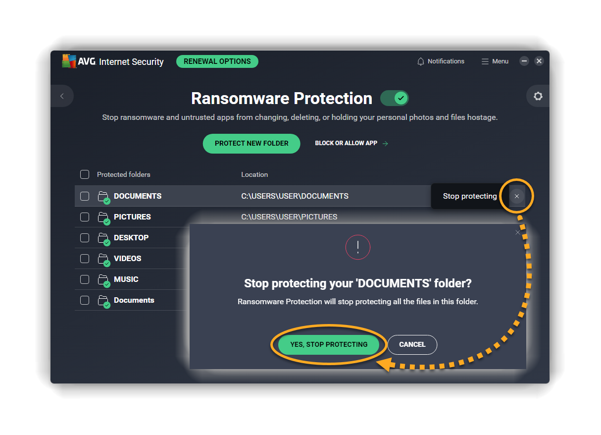 By default, Ransomware Protection automatically secures your Documents and Pictures folders. All subfolders of the protected folders will also be included. To add or remove folders from the Protected folders list: