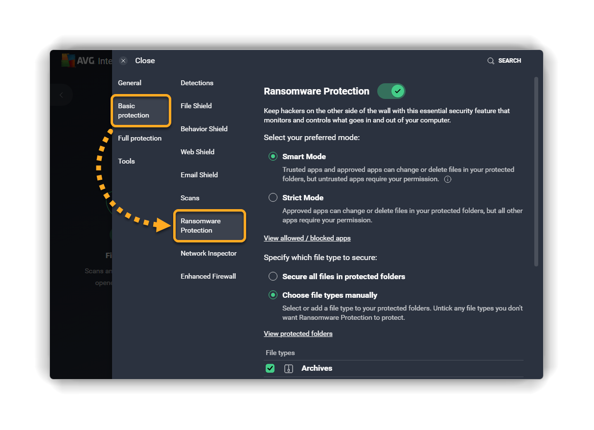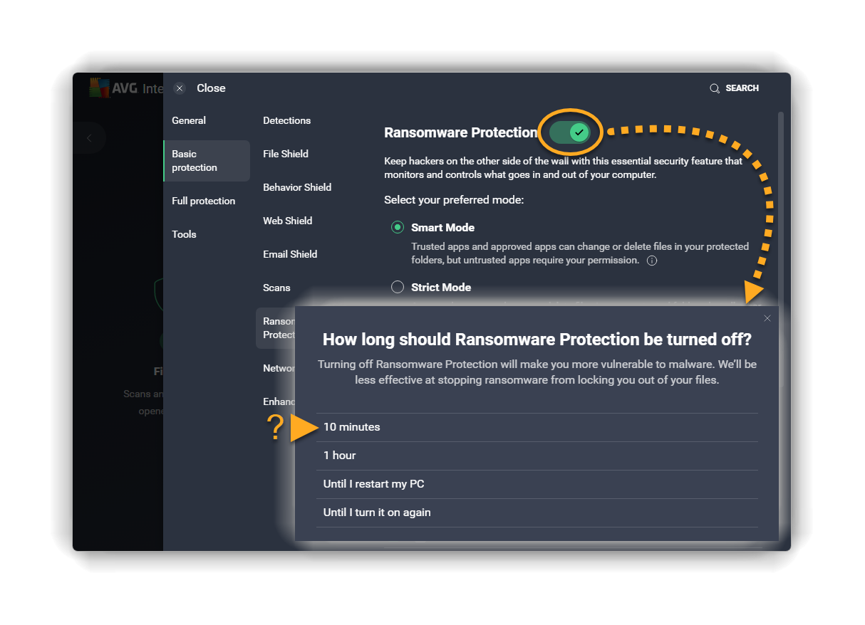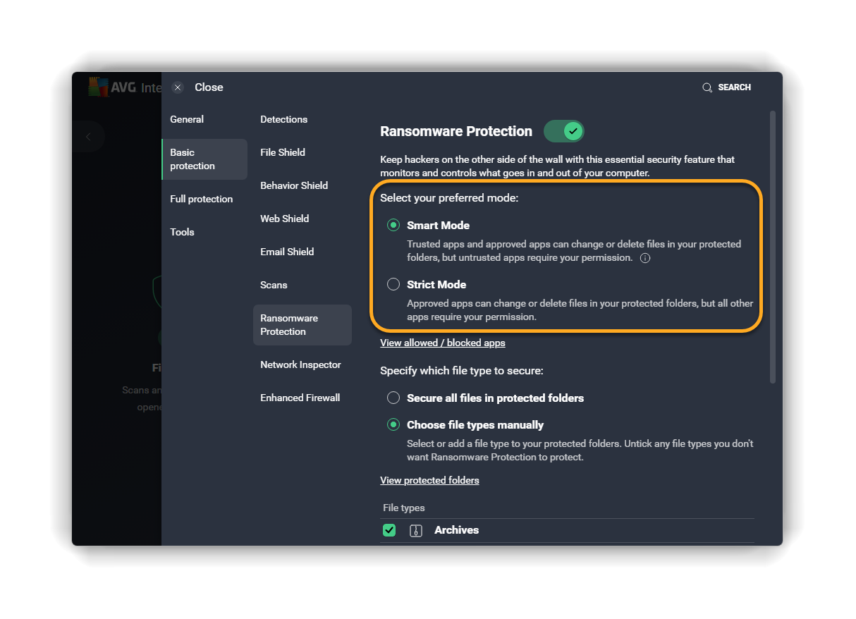 ☰Menu ▸ Settings ▸ Update, and click Check for updates in the application section. - Ransomware Protection displays pop-ups too frequently: Ensure that Ransomware Protection behavior is set to Smart Mode. If Ransomware Protection is set to Strict Mode, AVG AntiVirus notifies you every time any application attempts to modify files in your protected folders (excluding those you have already added to the Blocked & Allowed apps lists).